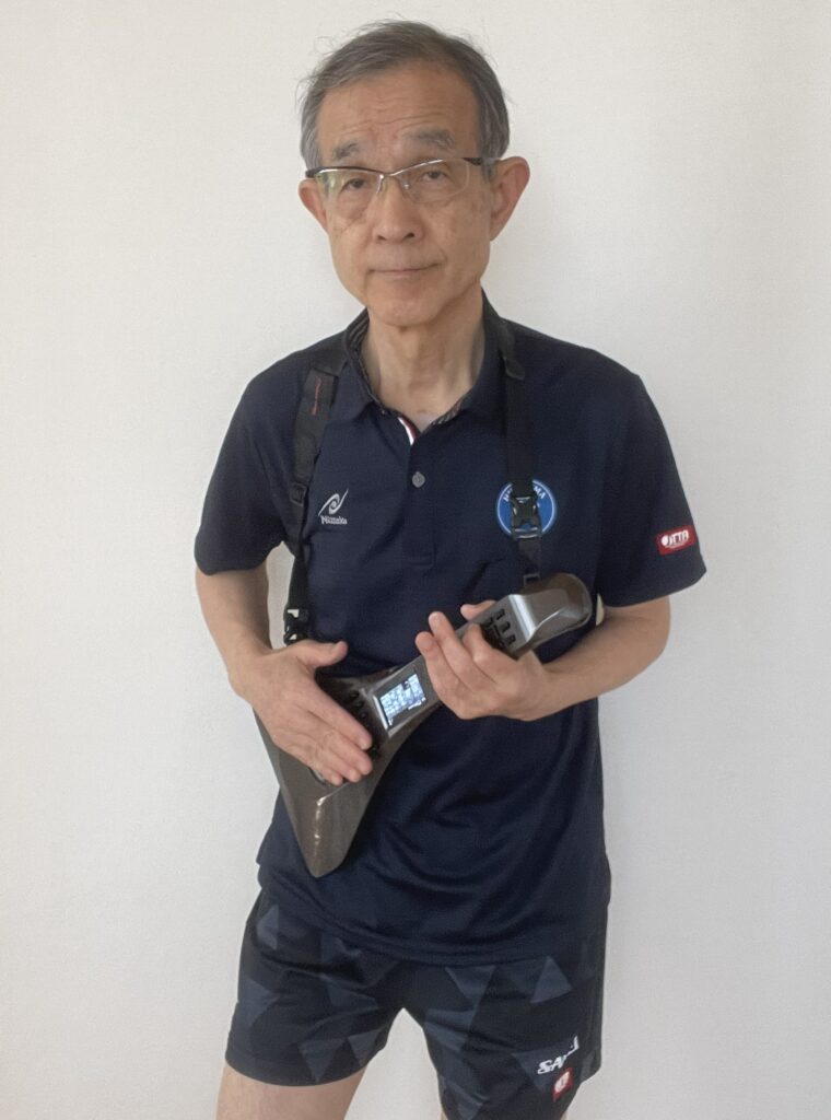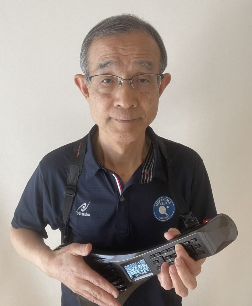 卓球のユニフォームを着てインスタコードを弾く筆者(中根 英昭)