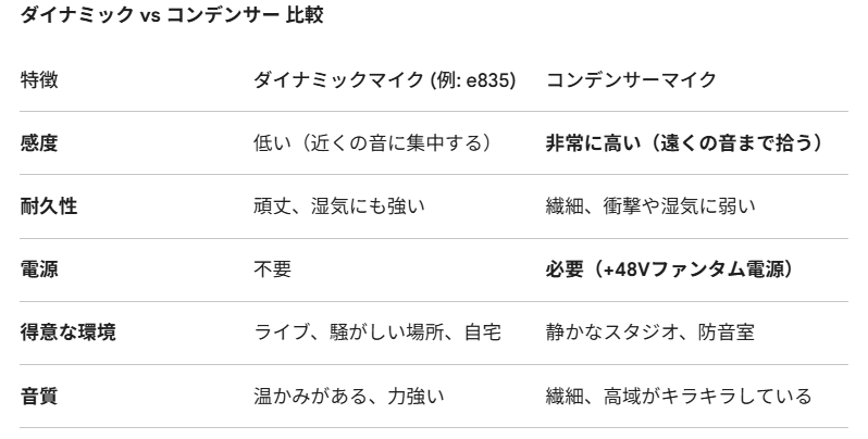 なるほど。でも、迷いますね。マイクの差が出る程の声ではないのですが。e835を選んだのは、安かったからです(amazonで9,900円、SM58は16,000円程度)というのは半分ぐらいは本当です。でも、本当のところ、結構真面目に考えたのです。Geminiは更に、「曲によって使い分ければよい」などとおっしゃるのですが、とりあえず1本で十分。ところで、何を弾き語りする?