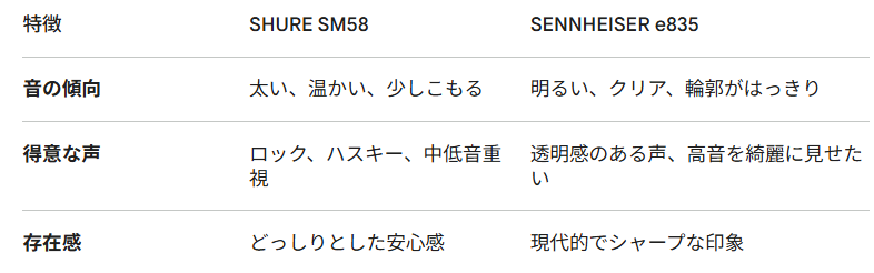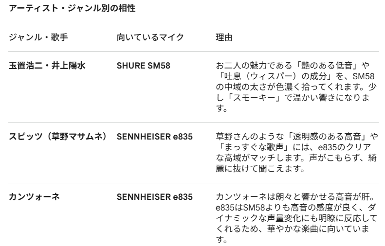 「得意な環境」を見ただけでもダイナミックマイクロフォン一択ですが、耐久性や電源の必要性からもダイナミックマイクロフォンを選んだ方が良いと判断できます。陽水さんが使っているマイクはSHURE SM58とのことですが、私が買ったSENNHEISER e835とがプロも使うダイナミックマイクロフォンの双璧だとのことです。その違いについてもGeminiに質問しました。また、適当に好きな歌手(歌いたい歌)を並べて、どっちのマイクが向いているか尋ねてみました。