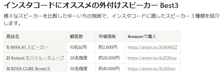 「1)MIFA A1 スピーカー」についてAmazonのカスタマーレビューを読んだところ、「これはBGM用のスピーカーとして最適」と思いました。インスタコードとボーカルの入力をバランスさせながら増幅するための「アンプを兼ねたスピーカー」としては全く使えないと思いました。