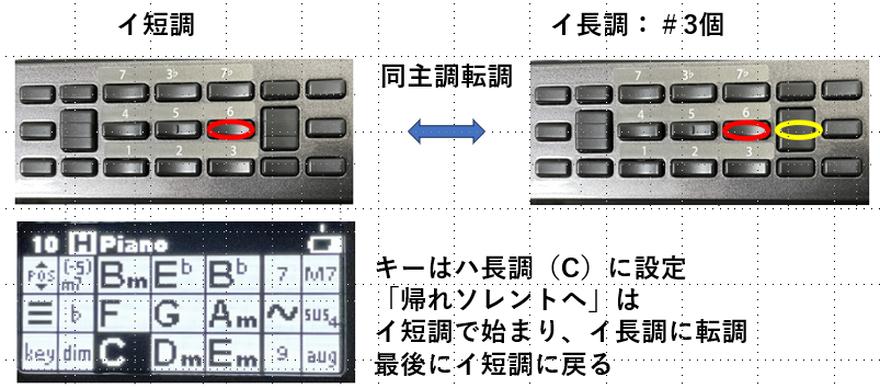 その唯一の弱点と言われてきた転調、それが「指1本の操作」で自由自在に操れることに気が付いてしまいました。この秘密を解くカギ、それは、「(キーをハ長調に設定した場合)イ短調(Am)とイ長調(A)を行き来する「同主調転調」にあります。イ短調の主音であるAmをAに変える操作はインスタコードでは「6番だけを押さえるAm」から「6番の隣の~」を一緒に抑えるだけなのです。