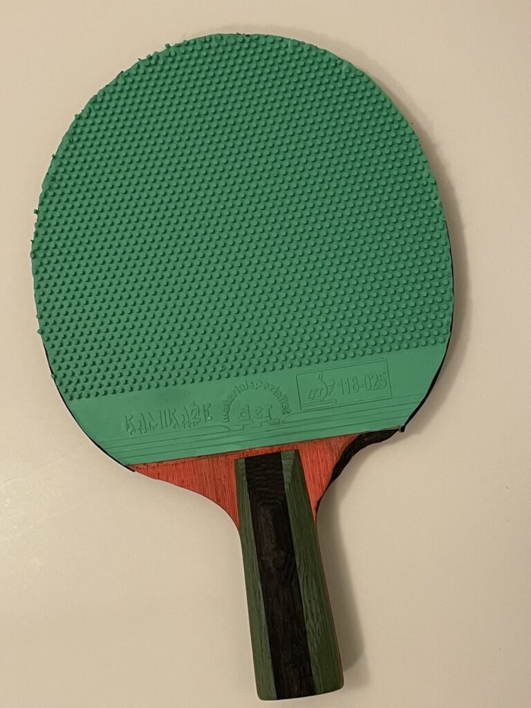 筆者(中根英昭;ニックネーム「へん粒」)のフォアハンドと裏面バックハンド(上)。2026年2月現在使用しているラケット(下面)。